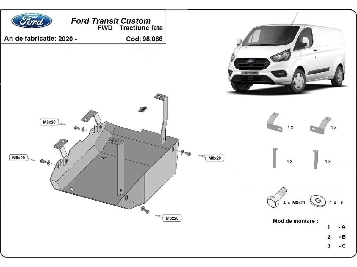 Ocelový kryt podvozku je přizpůsoben originálním montážním bodům a upevňuje se pomocí kompletní sady plechů, šroubů a matic.