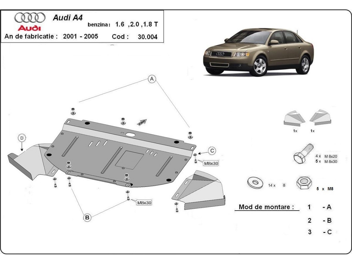 Ocelový kryt podvozku je přizpůsoben originálním montážním bodům a upevňuje se pomocí kompletní sady plechů, šroubů a matic.