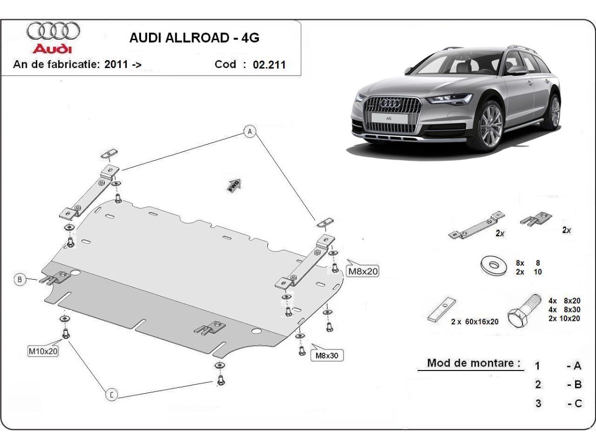 Ocelový kryt podvozku je přizpůsoben originálním montážním bodům a upevňuje se pomocí kompletní sady plechů, šroubů a matic.