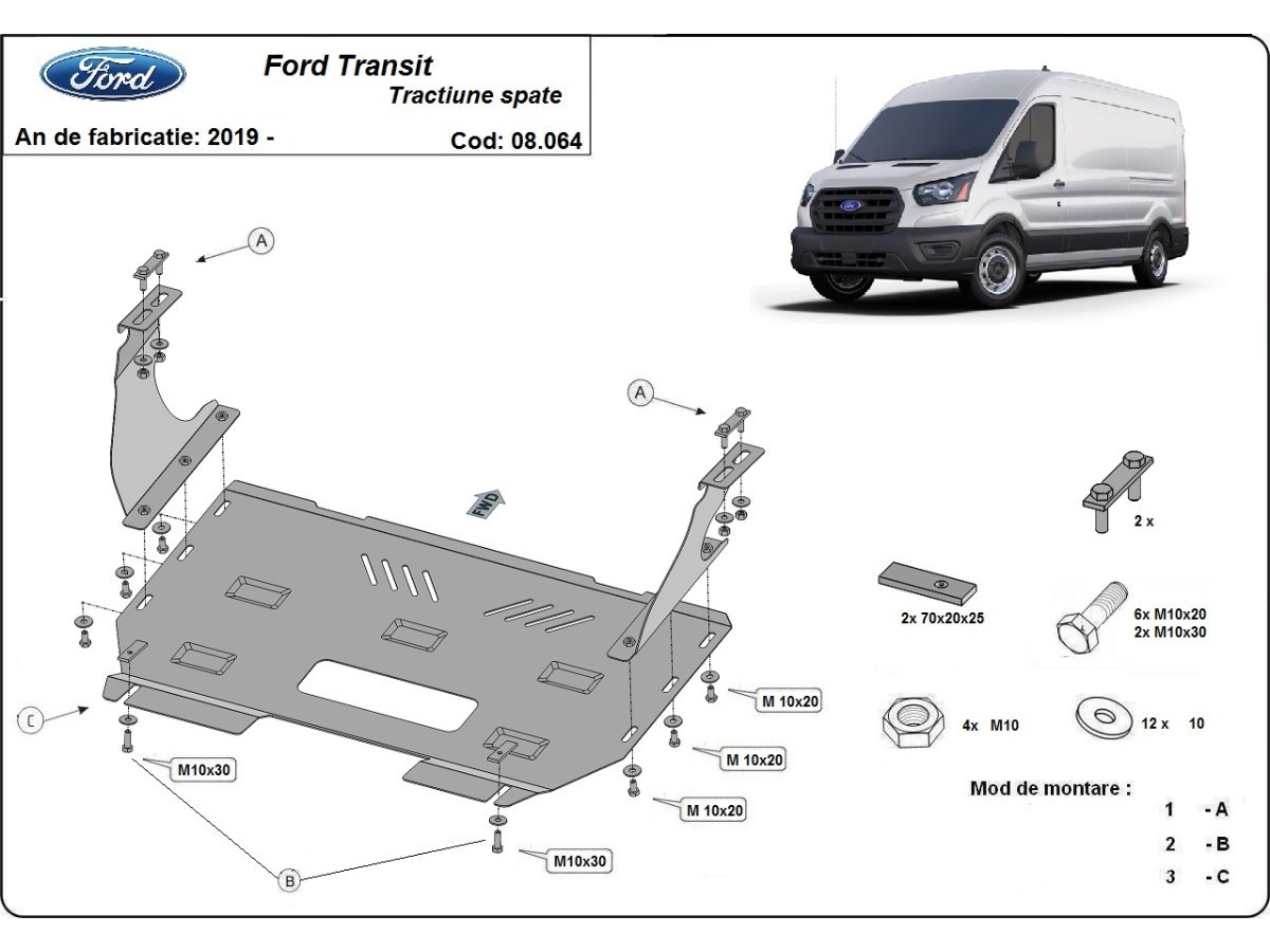 Ocelový kryt podvozku je přizpůsoben originálním montážním bodům a upevňuje se pomocí kompletní sady plechů, šroubů a matic.