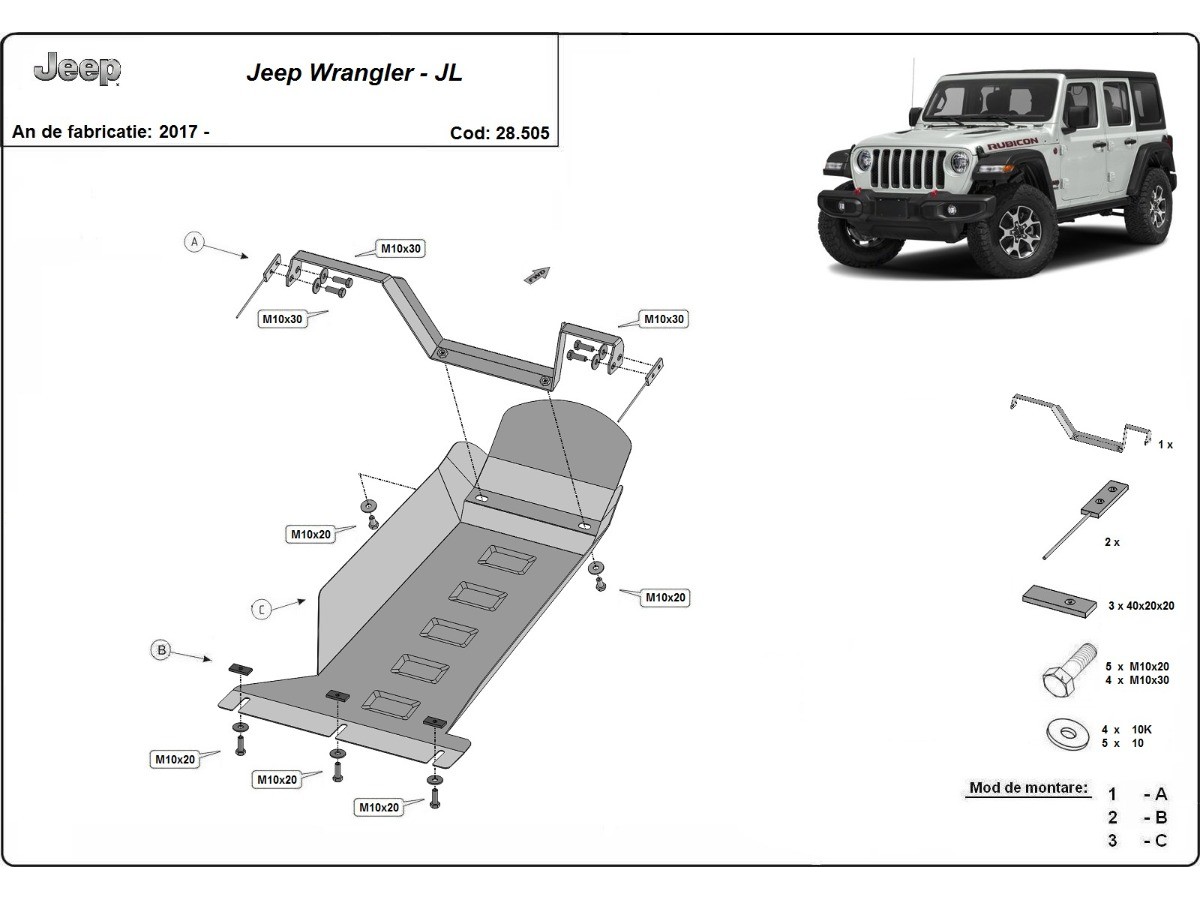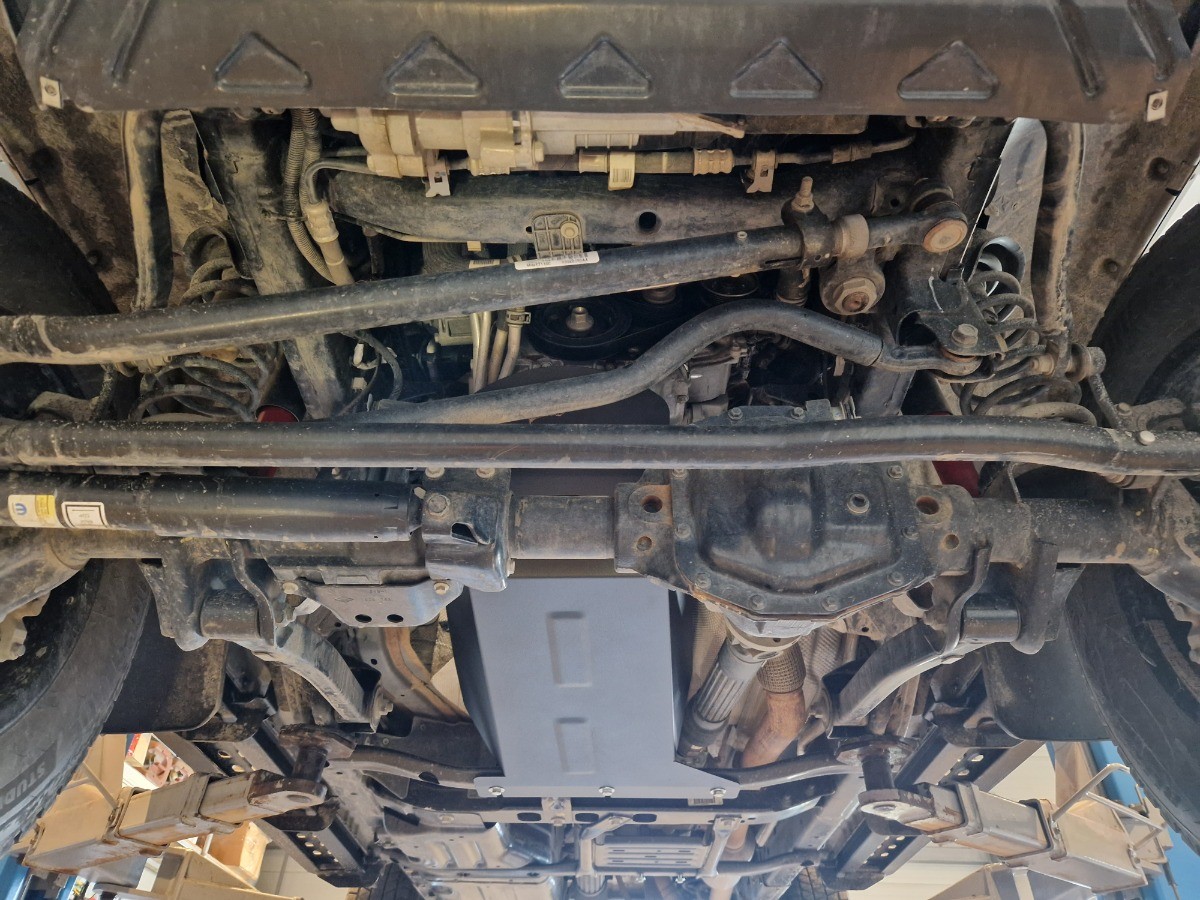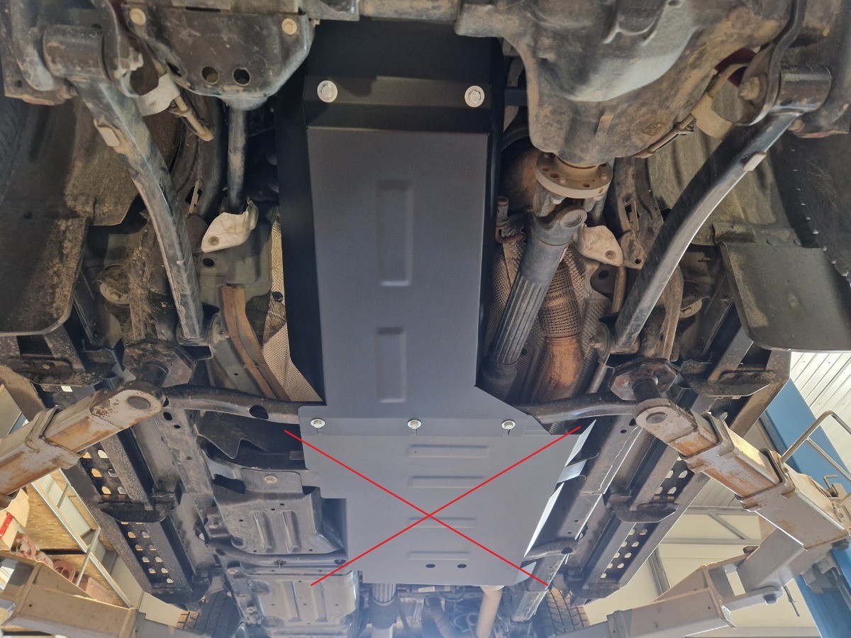 Ocelový kryt podvozku je přizpůsoben originálním montážním bodům a upevňuje se pomocí kompletní sady plechů, šroubů a matic.