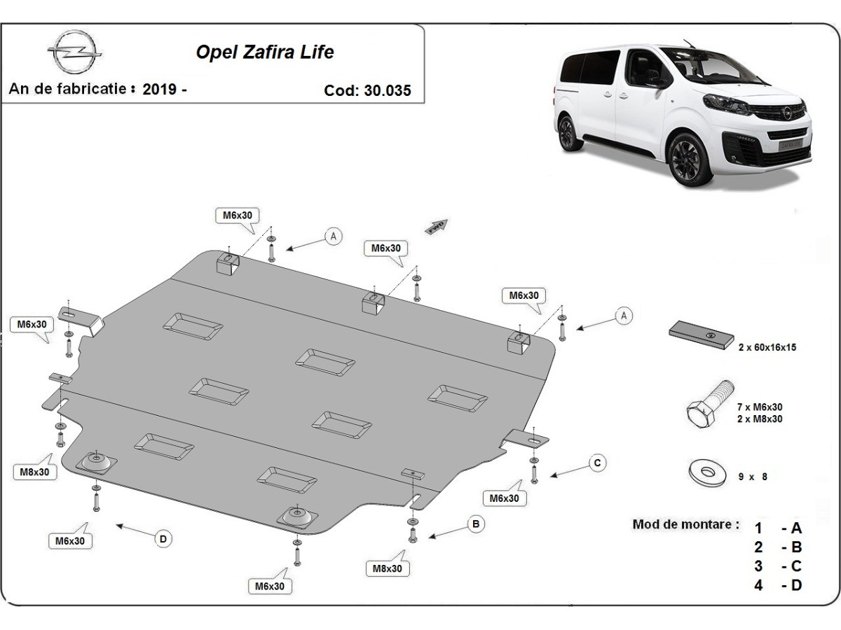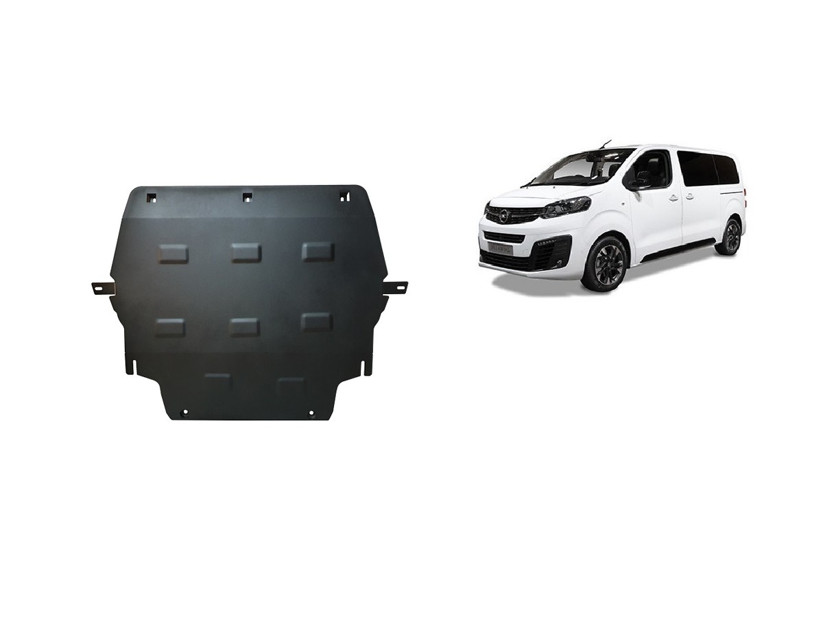 Ocelový kryt podvozku je přizpůsoben originálním montážním bodům a upevňuje se pomocí kompletní sady plechů, šroubů a matic.