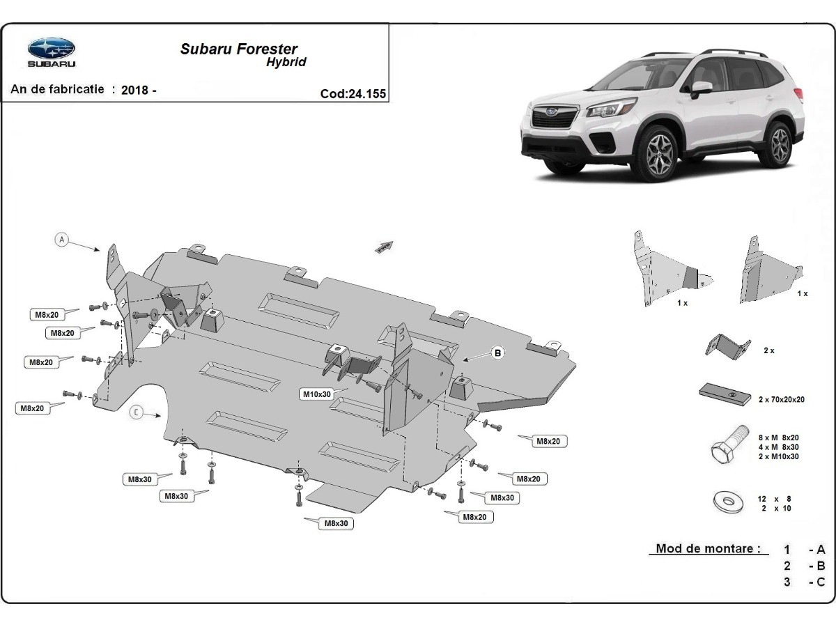 Ocelový kryt podvozku je přizpůsoben originálním montážním bodům a upevňuje se pomocí kompletní sady plechů, šroubů a matic.