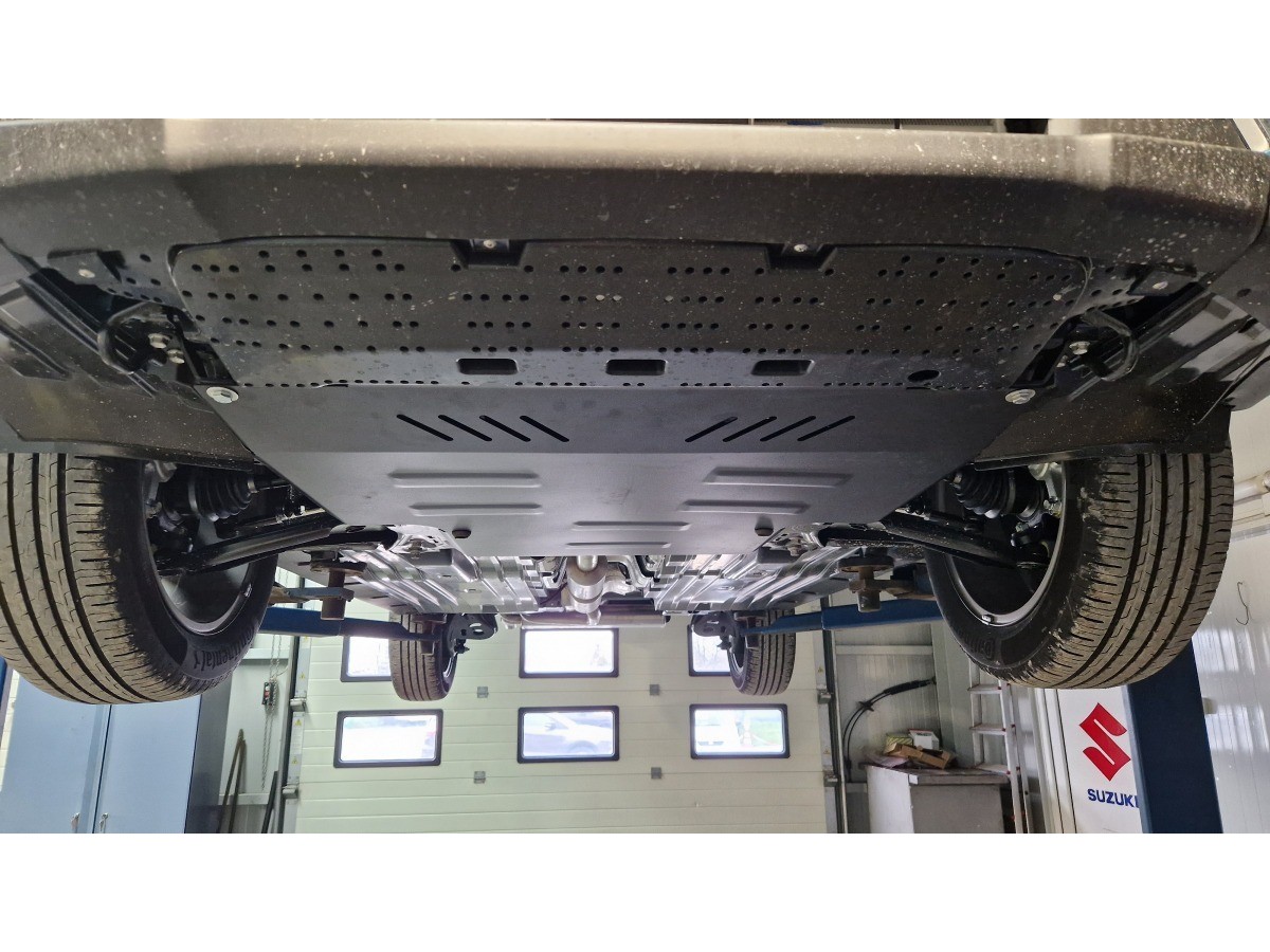 Ocelový kryt podvozku je přizpůsoben originálním montážním bodům a upevňuje se pomocí kompletní sady plechů, šroubů a matic.