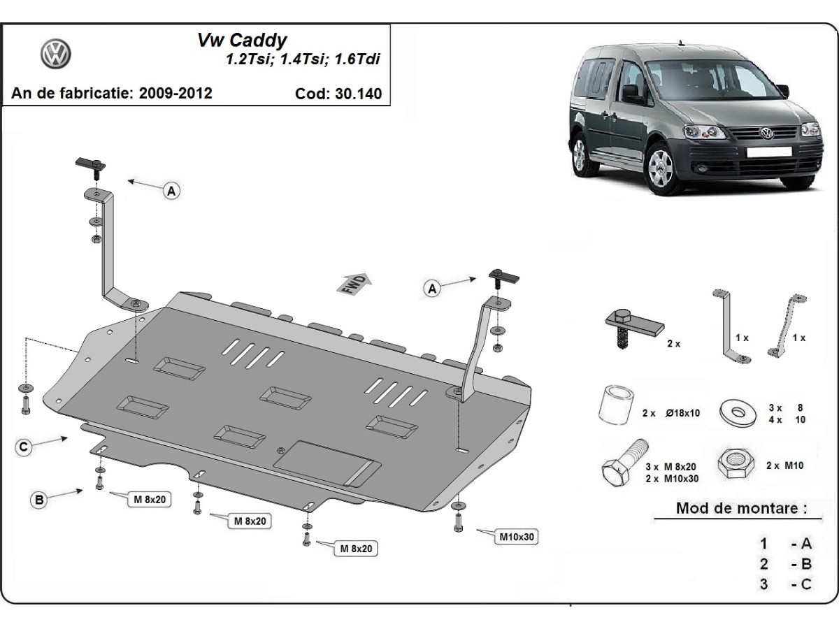 Ocelový kryt podvozku je přizpůsoben originálním montážním bodům a upevňuje se pomocí kompletní sady plechů, šroubů a matic.
