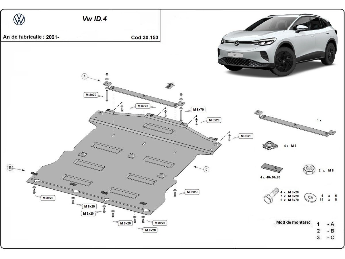 Ocelový kryt podvozku je přizpůsoben originálním montážním bodům a upevňuje se pomocí kompletní sady plechů, šroubů a matic.
