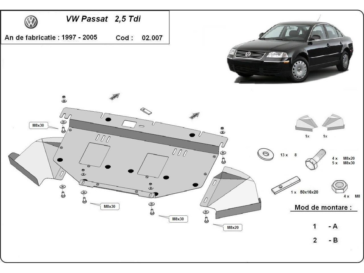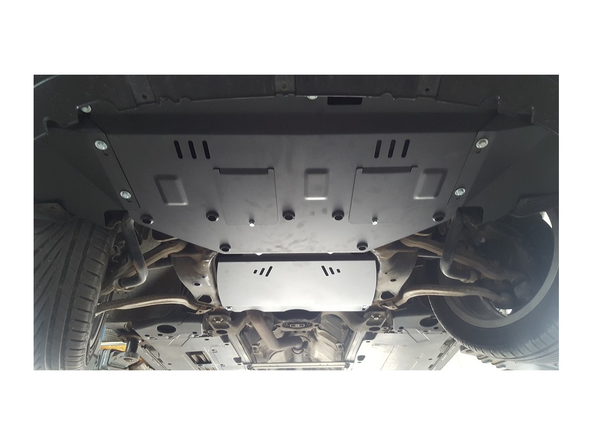 Ocelový kryt podvozku je přizpůsoben originálním montážním bodům a upevňuje se pomocí kompletní sady plechů, šroubů a matic.