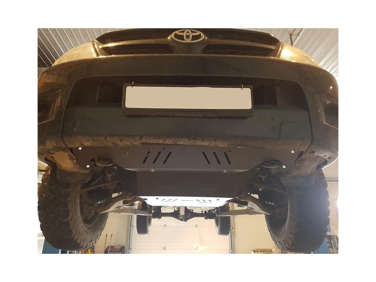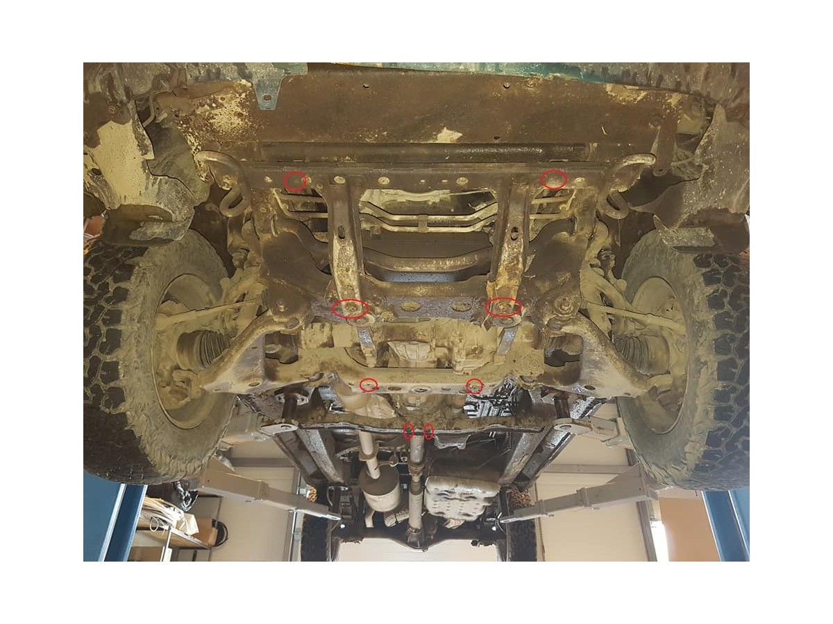 Ocelový kryt podvozku je přizpůsoben originálním montážním bodům a upevňuje se pomocí kompletní sady plechů, šroubů a matic.