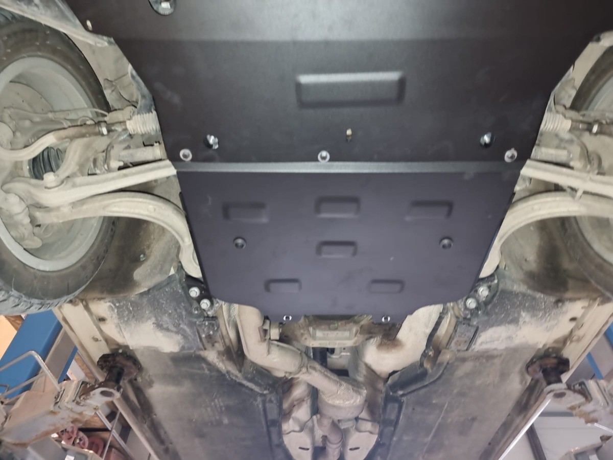 Ocelový kryt podvozku je přizpůsoben originálním montážním bodům a upevňuje se pomocí kompletní sady plechů, šroubů a matic.