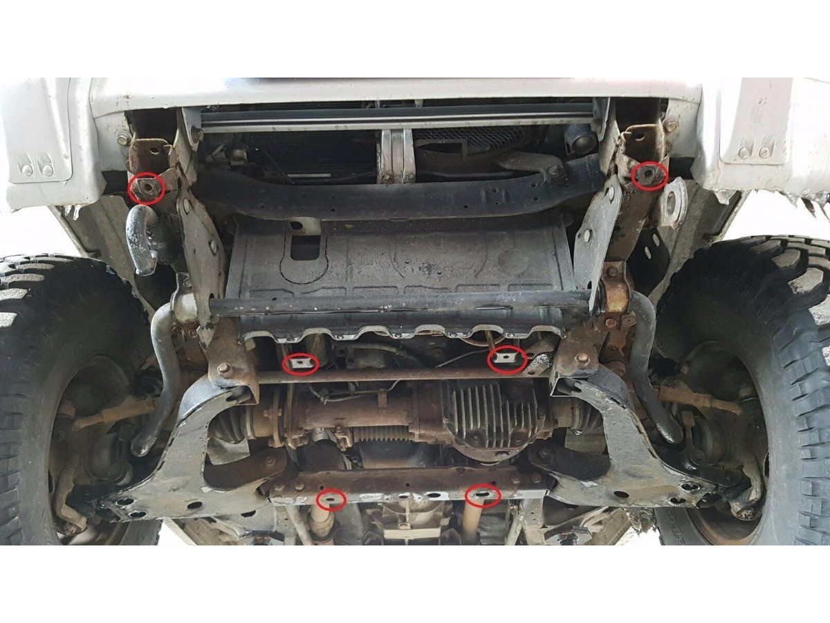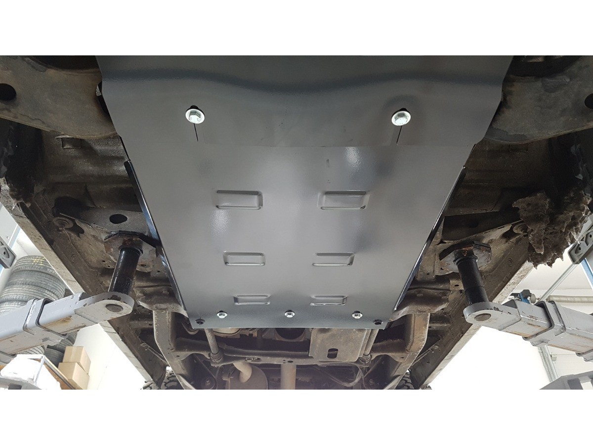 Ocelový kryt podvozku je přizpůsoben originálním montážním bodům a upevňuje se pomocí kompletní sady plechů, šroubů a matic.