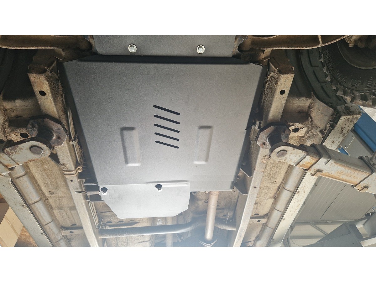 Ocelový kryt podvozku je přizpůsoben originálním montážním bodům a upevňuje se pomocí kompletní sady plechů, šroubů a matic.